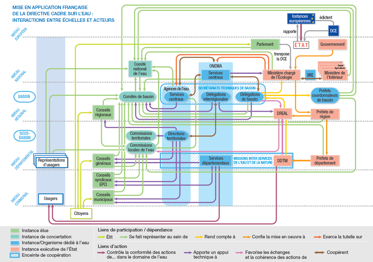 Pour cela elle s’appuie notamment sur des structures de pilotage (comité de l’eau et de la biodiversité, etc.) et des documents de planification (SDAGE, etc.).
