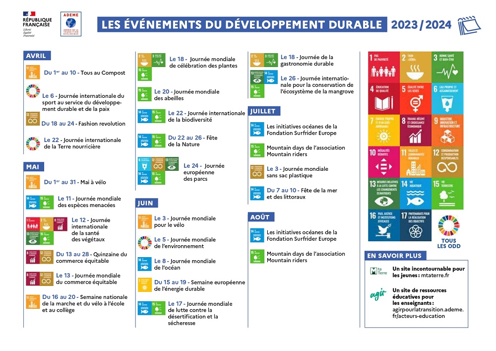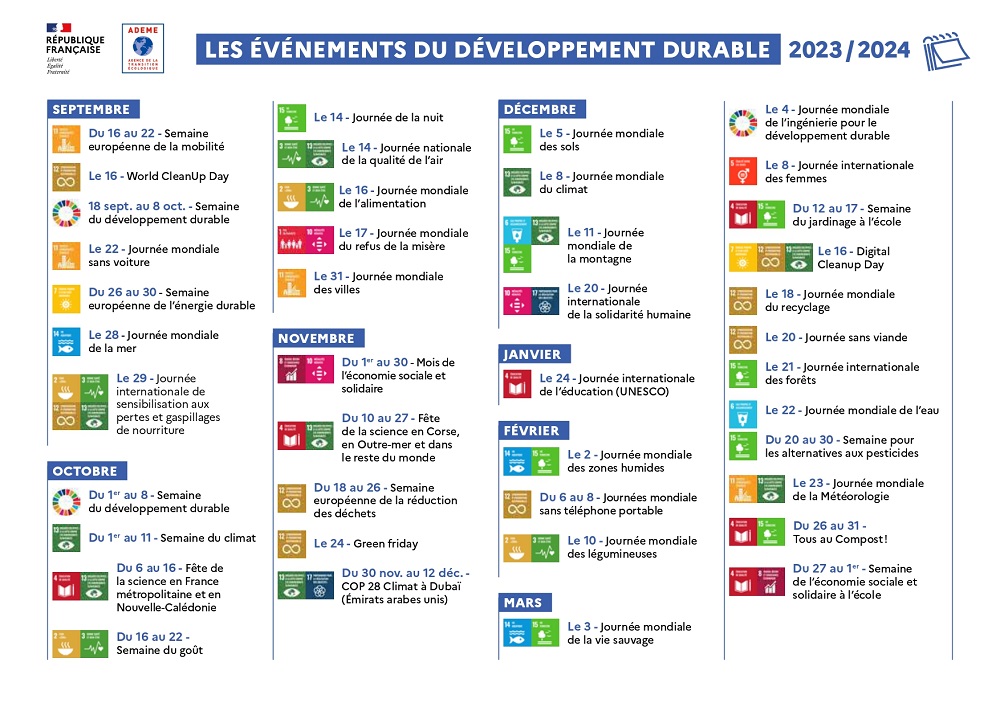 Le calendrier 2024 du développement durable est disponible ici. Vous y trouverez les principales dates pour l’organisation éventuelle de vos manifestations environnementales.