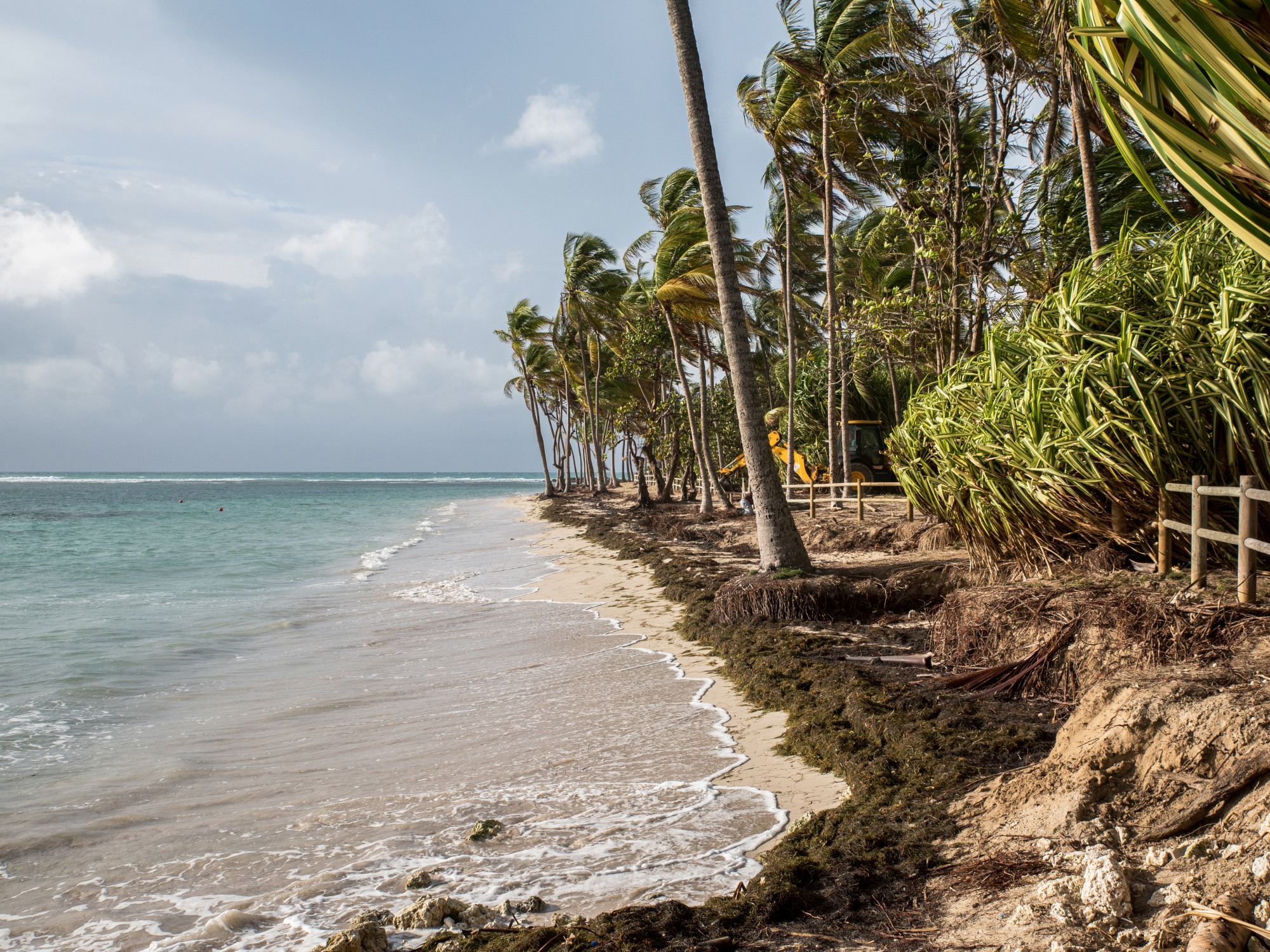 Les plages et les milieux littoraux ont également été particulièrement touchés, de façon variable selon leur situation. Beaucoup de plages ont été impactées par une forte érosion et un recul du trait de côte assez net (voir la comparaison du point de vue de la plage de la Caravelle) pendant que certaines ont été, à l’inverse, concernées par un phénomène d’accrétion par un apport de sable. La perte de végétation, l’accumulation de déchets et de débris se sont accompagnés sur un certain nombre de lieux par un impact important sur la faune et en particulier sur les sites de ponte des tortues marines.