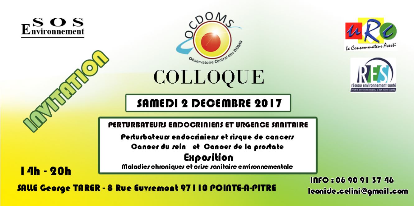 Colloque des associations OCDOMS (Observatoire Central des Outre-mers) , SOS Environnement et Union régionale des consommateurs sur le thème " Perturbateurs Endocriniens et urgence sanitaire". Il a lieu le 2 Décembre 2017, de 14 à 20 heures à la salle George TARER à Pointe à Pitre.