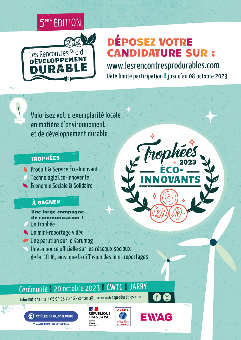 A l’occasion des Rencontres Pro du Développement Durable les 19 et 20 octobre 2023, la Chambre de Commerce et d’Industrie des Iles de Guadeloupe avec le soutien de l’ADEME, vous invite à concourir aux « Trophées Eco - Innovants ».
