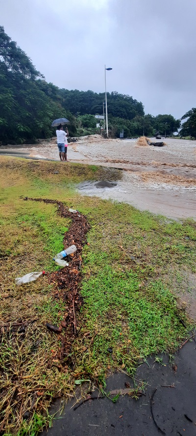 Exemple d’une marque temporaire laissée par l’inondation de la Ravine Salée à Rivière Sens (Gourbeyre) suite à la tempête Fiona le 17 septembre : le dépôt de matière solide au sol (débris végétaux, déchets plastiques) matérialise l’emprise maximale atteinte par l’eau lors de l’inondation.