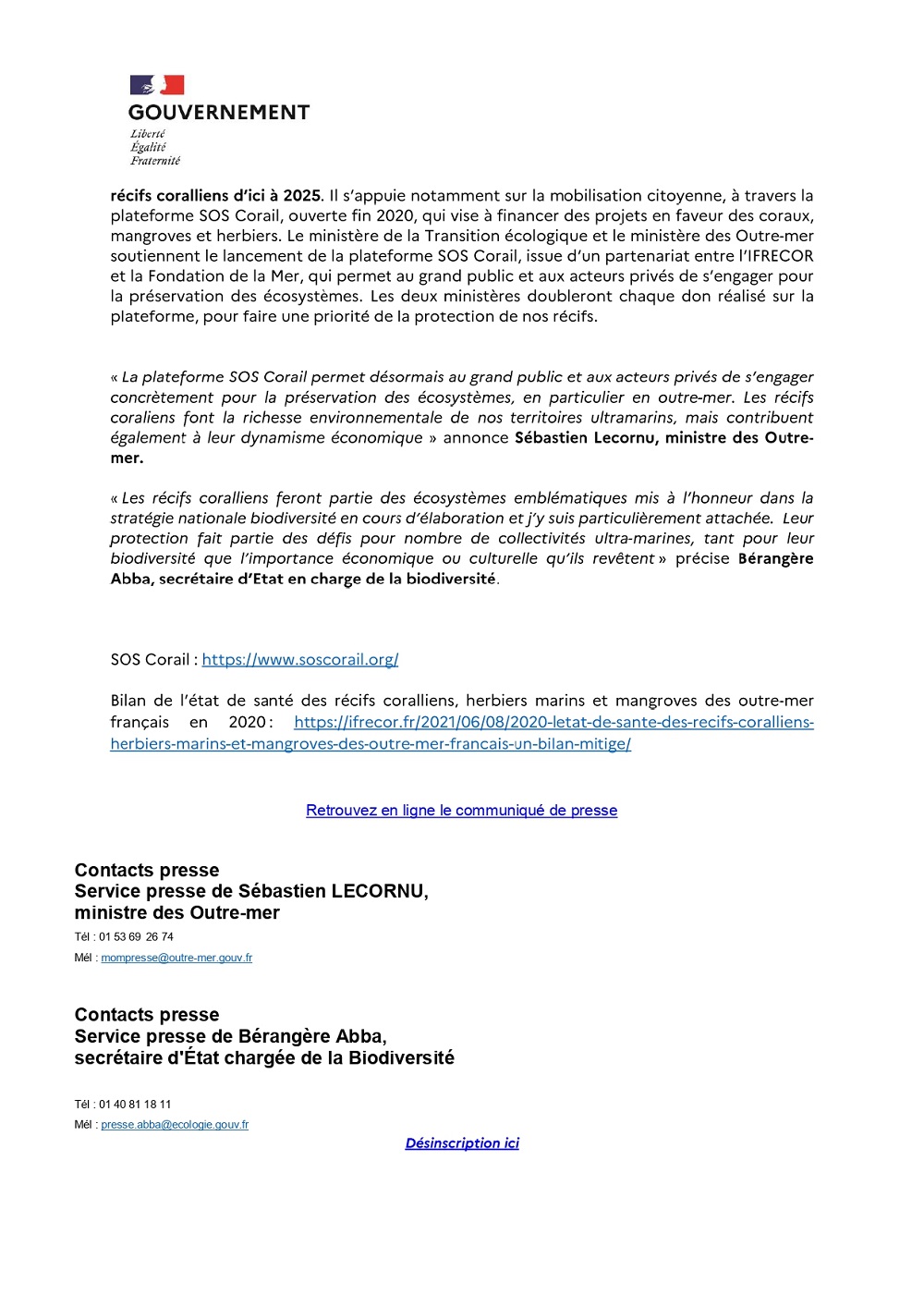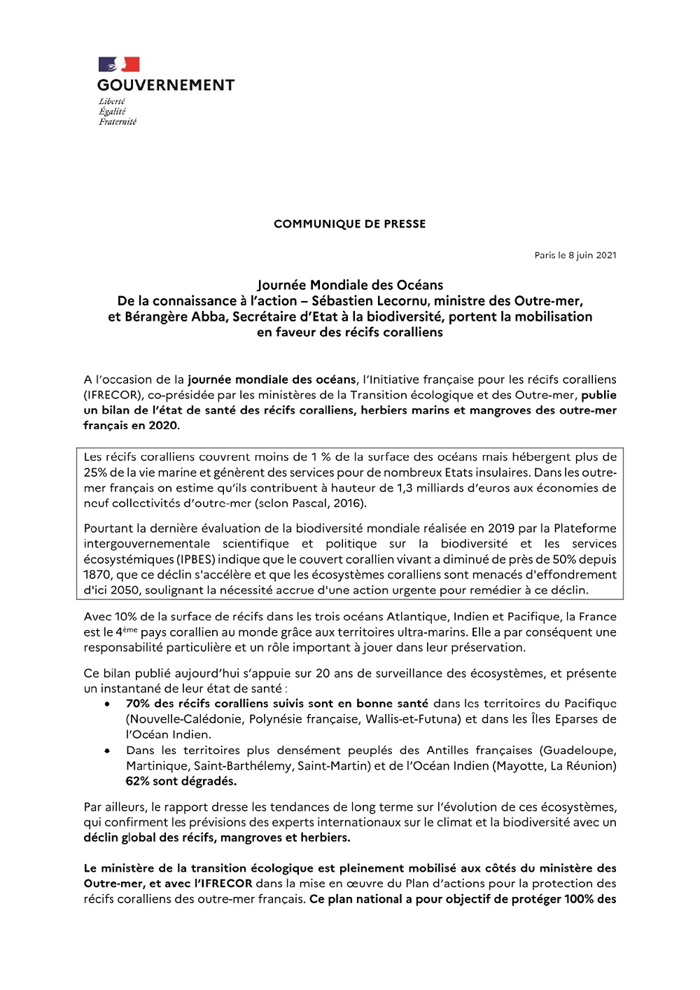 Bilan de l’état de santé des récifs coralliens, herbiers marins et mangroves des outre-mer français en 2020 : https://ifrecor.fr/2021/06/08/2020-letat-de-sante-des-recifs-coralliens-herbiers-marins-et-mangroves-des-outre-mer-francais-un-bilan-mitige/