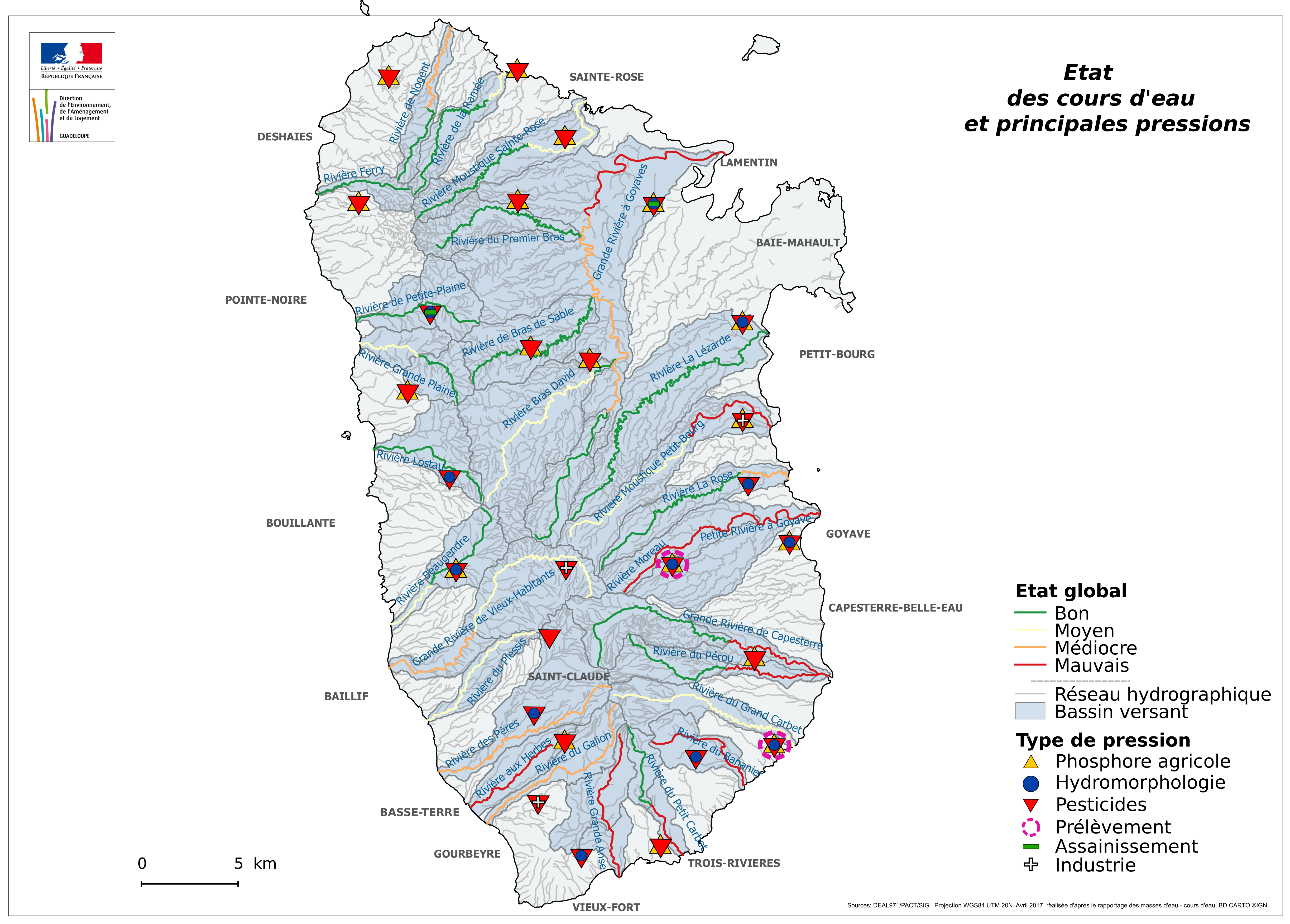 La principale pression exercée sur les cours d’eau est liée aux pesticides, particulièrement la chlordécone et dans une moindre mesure l’HCH-béta et la diedrine, utilisés dans les cultures de bananes. La présence de ces pesticides explique le classement en état mauvais ou médiocre de la majorité des cours d’eau du Sud Basse-Terre (pollution historique du croissant bananier).