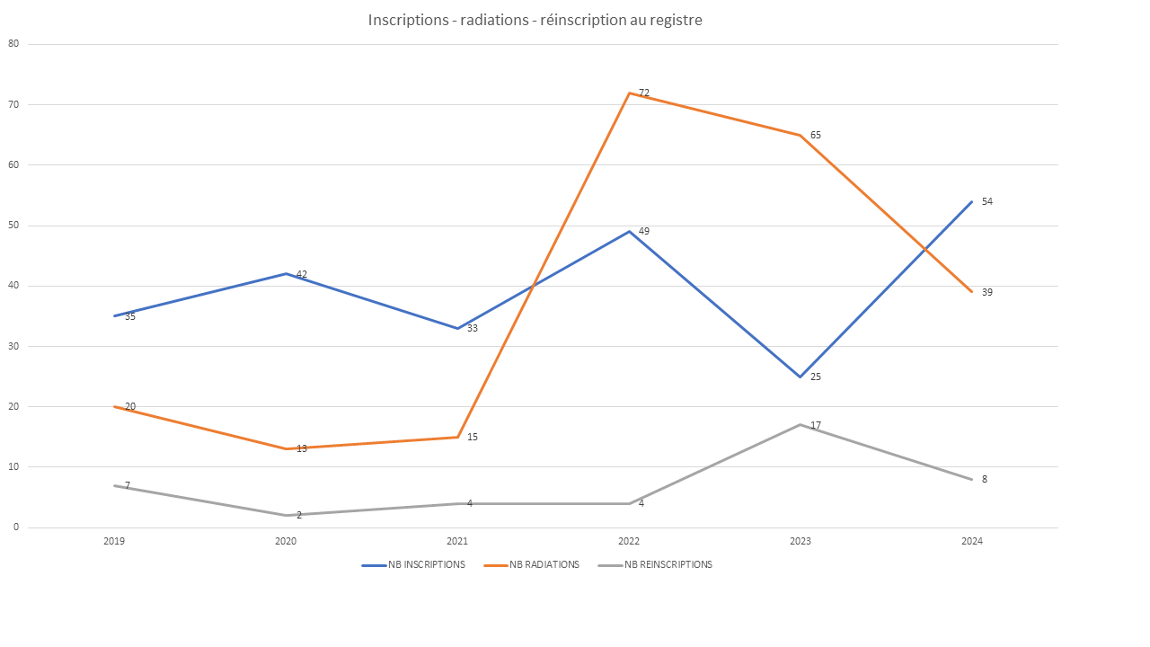 Après une forte augmentation du nombre de radiations pour défaut de la condition financière en 2022, le nombre a diminué progressivement ; 39 entreprises ont été radiées en 2024 au terme de la procédure de régularisation.