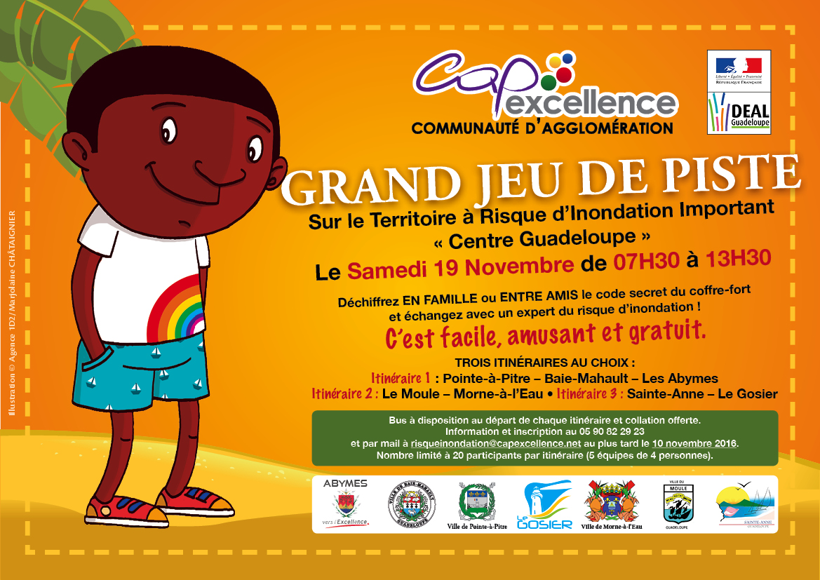 A l’occasion de l’anniversaire des inondations provoquées par le cyclone Lenny (19 novembre 1999), la communauté d’agglomération CapExcellence organise en partenariat avec la DEAL un grand jeu de piste sur le territoire à Risque d’Inondation Important (TRI) Centre Guadeloupe le 19 novembre 2016 de 7h30 à 13h30. Testez vos connaissances sur le risque d’inondation : inscrivez-vous ! C’est facile, amusant et gratuit.