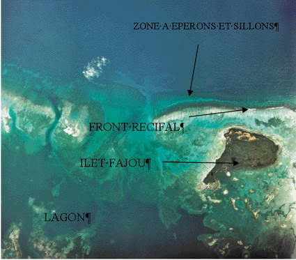 • une zone supérieure (0 à - 10 m) à éperons et sillons, caractérisée par les constructions en éperons essentiellement dues à Acropora palmata. Aujourd’hui presque tous ont disparus, détruits par une maladie, ainsi que par les derniers cyclones. Entre 5 et 10 m, le fond est constitué par une dalle arasée où le recouvrement de Scléractiniaires est faible.