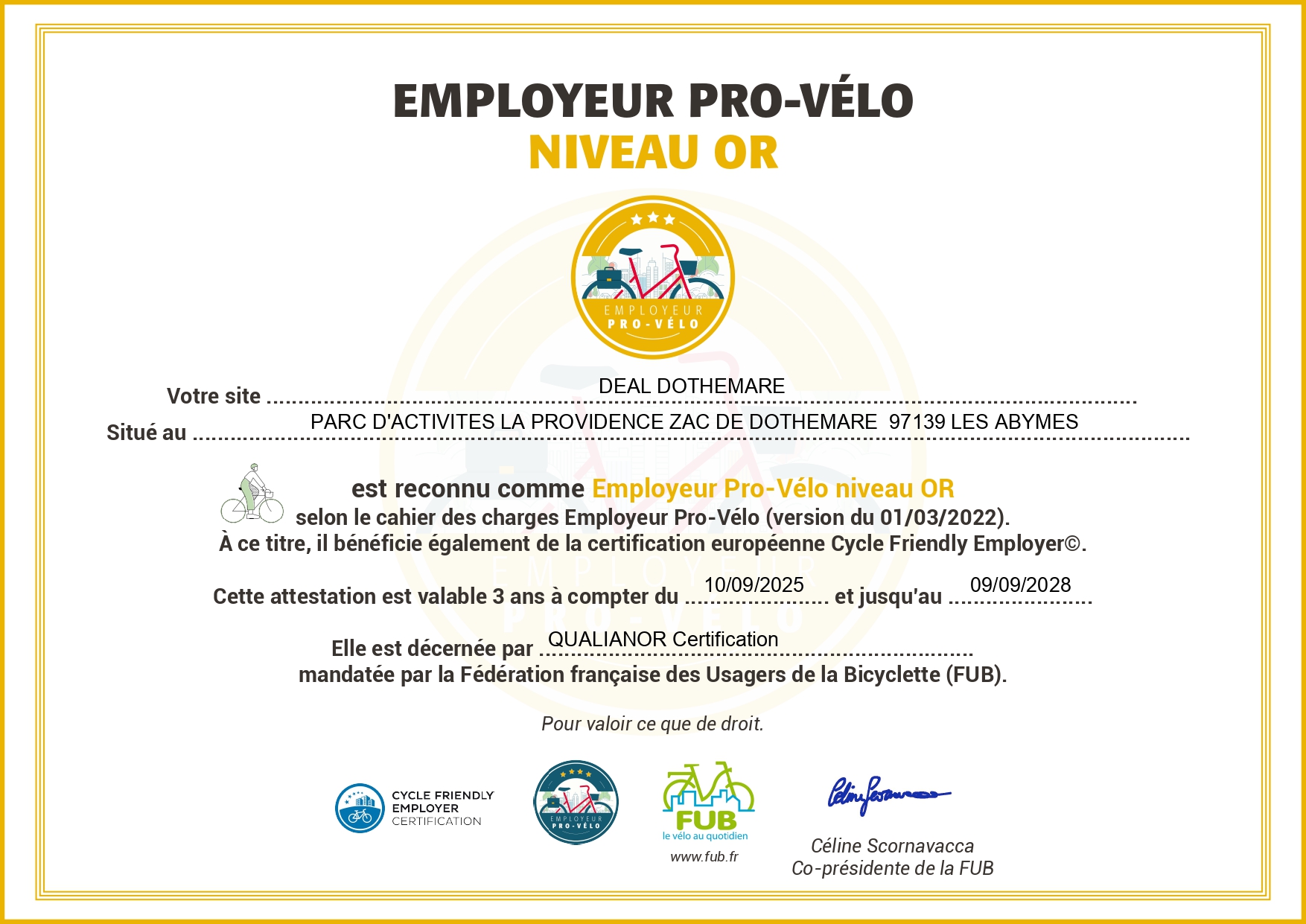 La DEAL labellisée Employeur Pro-Vélo niveau OR