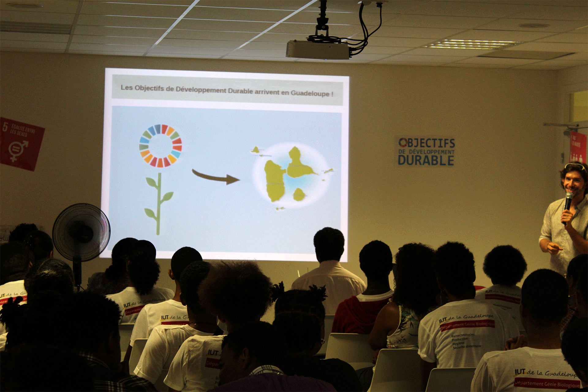 Le lundi 29 au matin, la DEAL a donc ouvert ses portes à deux classes de seconde du lycée Gerville Réache de Basse-Terre et une classe d’étudiants en Génie Biologique de l’IUT du Camp Jacob de Saint-Claude, soit une centaine d’acteurs futurs du développement durable de la Guadeloupe ! Dans un premier temps, la conférence animée par Adrien GOREZ (stagiaire MMDDE) a permis d’aborder les freins actuels propres à l’archipel (une gestion des déchets améliorable, la dépendance à l’importation alimentaire mais également énergétique, etc.). Puis, les leviers existant pour une transition écologique vers les ODD ont été discutés (le potentiel d’un tel linéaire côtier, un taux d’ensoleillement élevé etc.)