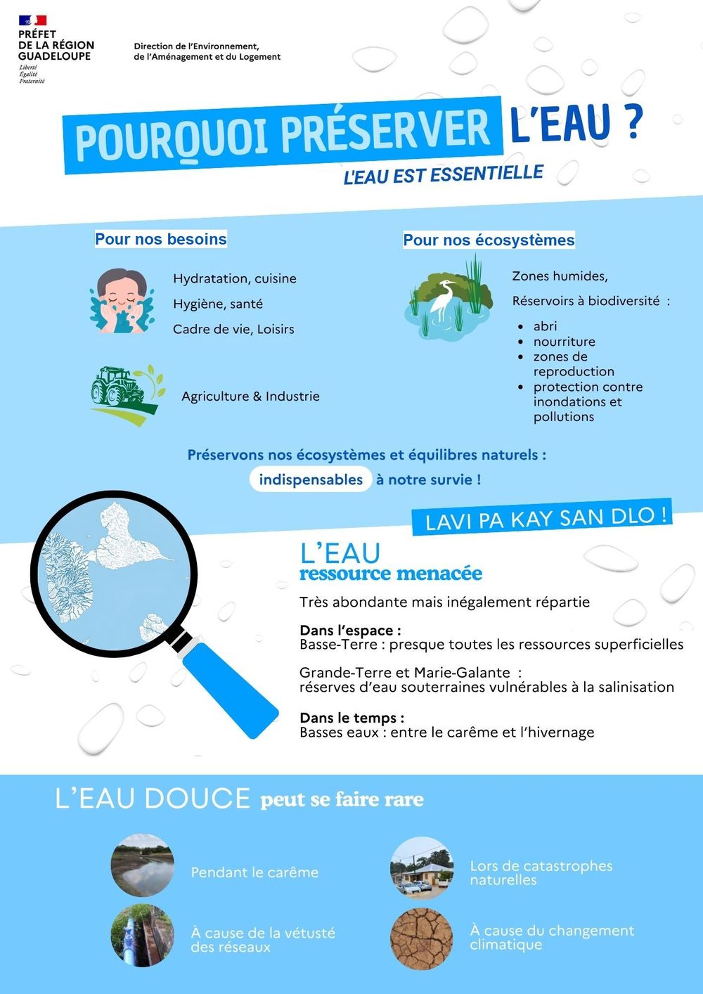 Néanmoins, par souci de solidarité, de pédagogie et d’anticipation, l’arrêté cadre prévoit que les mesures de restriction des usages domestiques et/ou socioprofessionnels s’appliquent à l’ensemble de la Guadeloupe dès lorsqu’un seuil est franchi sur l’une des zones.