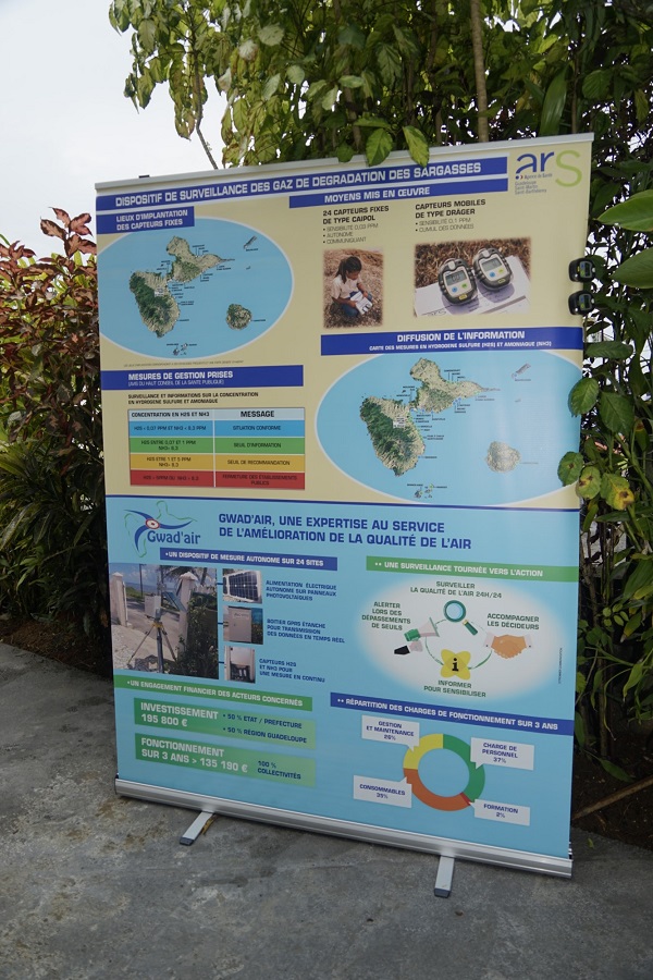 Une présentation a été faite à l’assistance concernant le nouveau dispositif de surveillance de gaz émis lors de la dégradation des Sargasses, [sulfure d’hydrogène (H2S) ; ammoniaque (NH3)] sur 24 sites de la Guadeloupe, ainsi que du matériel de ramassage des Sargasses.