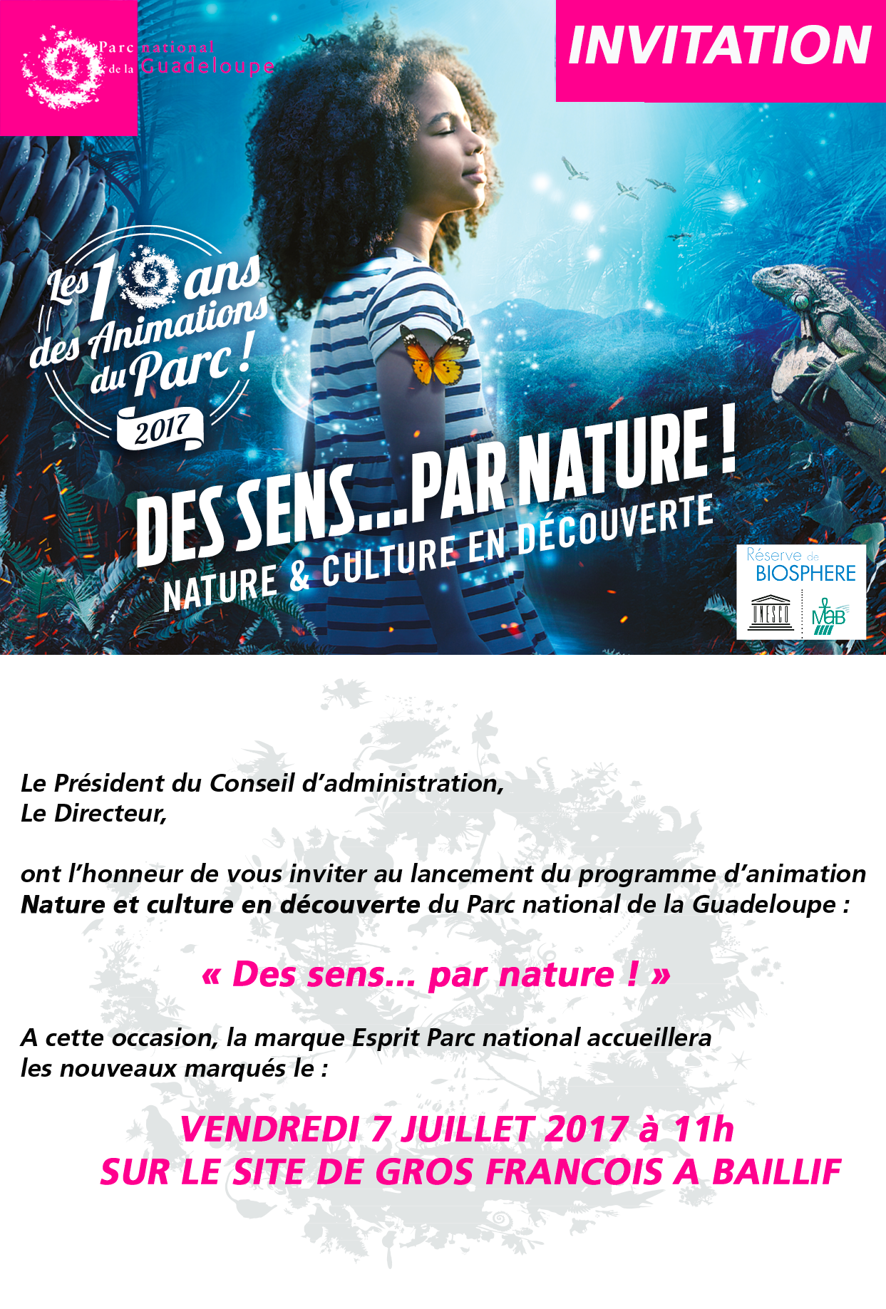 Le Parc national de la Guadeloupe vous convie au lancement des 10 ans de son programme d’animation Nature et Culture en découverte des grandes vacances au tour du thème " Les sens… par nature ! " le 7 juillet 2017 à 11h00 au site de Gros François à Baillif.
