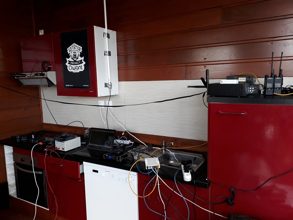 Journée de mise en pratique des outils développés par l’équipe. Community-managers, cartographes, codeurs, dronistes, radioamateurs – tous étaient en effervescence sur un camp de base bien équipé : autonomie partielle en électricité (indépendance énergétique de secours créée grâce à deux panneaux solaires, une batterie de voiture et un alternateur), multiples antennes radio dressées, étalage d’ordinateurs se faisant face, radios et talkies-walkies sur les tables, drone prêt à s’envoler.