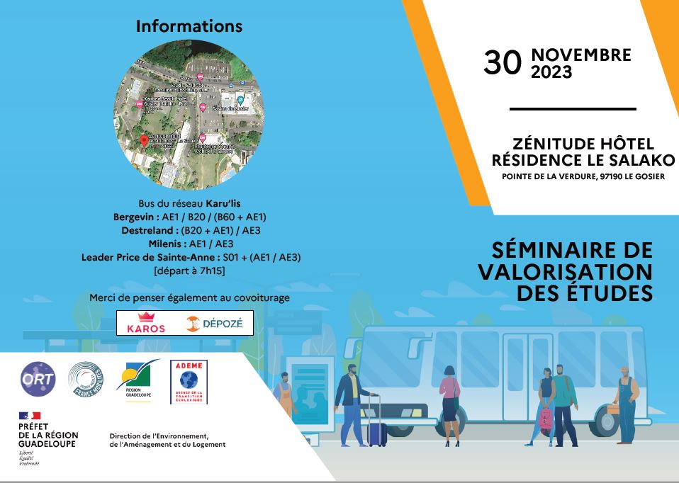 La DEAL, l’ADEME et le Conseil Régional ont organisé un séminaire de valorisation des études de l’Observatoire Régional des Transports (ORT) jeudi 30 novembre 2023 au Zénitude hôtel résidence le Salako au Gosier. Ce sont plus de 30 personnes qui se sont réunies ce jour dont trois élus de Guadeloupe, des représentants d’autorités organisatrices de la mobilité, de communes, d’EPCI, d’associations, de la CCI et d’entreprises pour échanger sur les sujets des transports et de la mobilité.