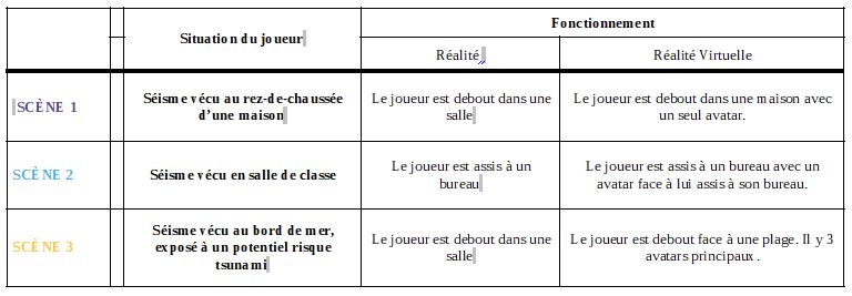 Destinée au grand public, chaque expérience durera approximativement 30 minutes (briefing, temps de passage en réalité virtuelle sur 1 scène et débriefing). 3 situations de tremblement de terre différentes ont été développées pour créer trois scènes en réalité virtuelle. Chacune de ces scènes se déroulera dans des espaces virtuels différents : une maison, une salle de classe et enfin une rue de bord de plage.