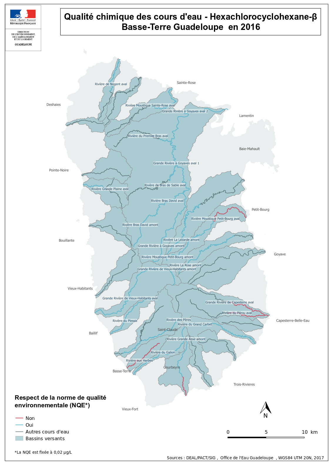 À partir des données collectées par l’Office de l’eau dans le cadre du programme de surveillance de 2016 des cours d’eau de Guadeloupe, deux cartes concernant la chlordécone et l’HCH-béta (hexachlorocyclohexane) ont pu être dressées. La chlordécone et l’HCH-béta ont été sélectionnés pour illustrer la pollution diffuse par les pesticides, car ce sont les éléments chimiques déclassant majoritairement retrouvés.