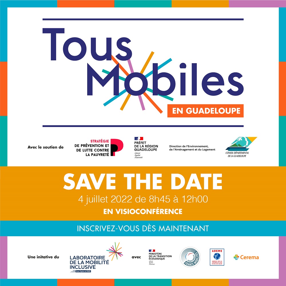 La rencontre Tous Mobiles aura lieu le 04 juillet 2022 en visioconférence de 08h45 à 12h00 (horaires Guadeloupe). Elle est organisée avec le soutien du commissaire à la lutte contre la pauvreté auprès du préfet de Guadeloupe, et avec le soutien du Conseil Départemental de Guadeloupe et de la Direction de l’Environnement, de l’Aménagement et du Logement.