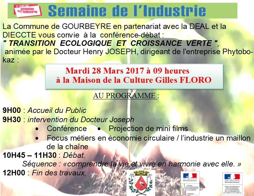 Vous êtes convié à la conférence-débat "TRANSITION ECOLOGIQUE ET CROISSANCE VERTE", animée par le Docteur JOSEPH, dirigeant de l’entreprise Phytobokaz