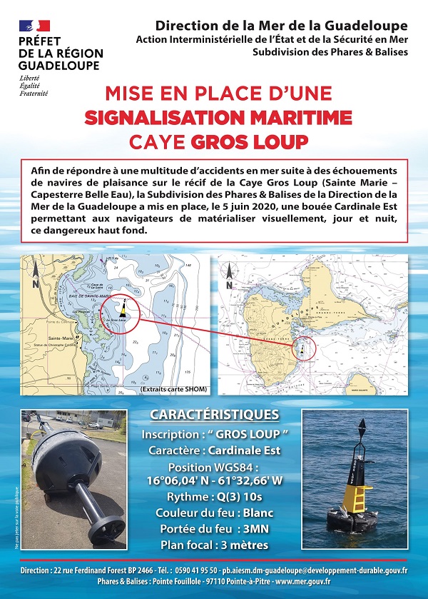 Communiqué de presse du 11 juin 2020 en téléchargement ci-dessous, relatif au mouillage de la bouée nouvelle baptisée "Gros Loup" au large de Sainte-Marie, entre la Pointe de la Rivière à Goyave et la Pointe de Capesterre-Belle-Eau.