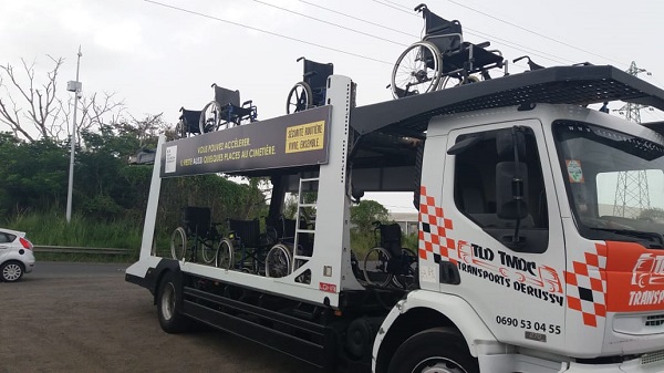 Ce slogan est véhiculé par un camion porte-voitures, transformé pour l’occasion en porte-fauteuils roulant.